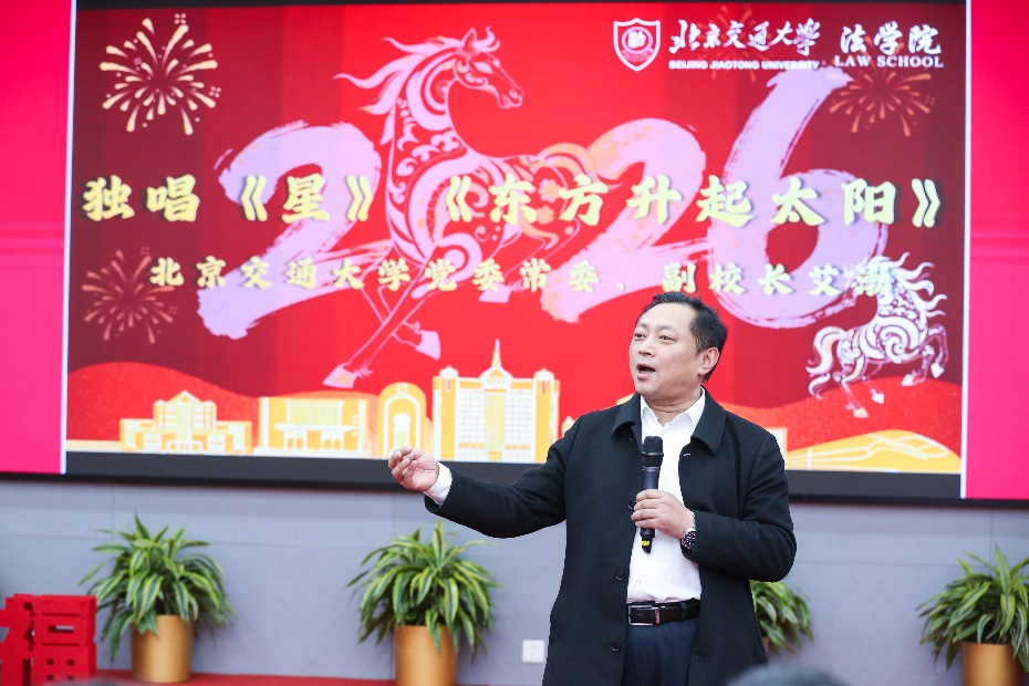 艾渤代表学校对欧博allbet百家乐试玩平台 过去一年取得的成绩给予充分肯定,向全院教师致以诚挚的问候和新年祝福,希望全体教职工新的一年,凝心聚力、开拓创新,共同谱写欧博allbet百家乐试玩平台 高质量发展的新篇章。随后,艾渤倾情演唱《星》《东方升起太阳》,并与国际法学系副教授王晨合唱《领航》,歌声昂扬、寄望深远。